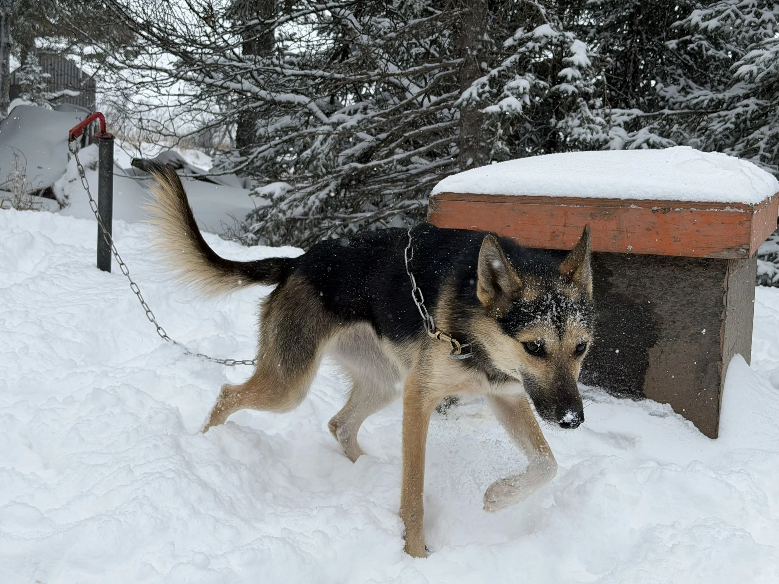 Yarrow has slowly been working her way to the top of our team. At the start of the season I wasn’t sure if Yarrow was going to make the main race team, and now I have absolutely no doubt! Yarrow has taken to spending her time running in point behind the leaders. She is easy to hook up and has a great attitude. She likes to jump down the trail for the first few miles of our run, bouncing in her harness over and over again. Fun dog to have on the team. Yarrow is a part of our kennels first ever litter of pups. (Ripple x Spark)